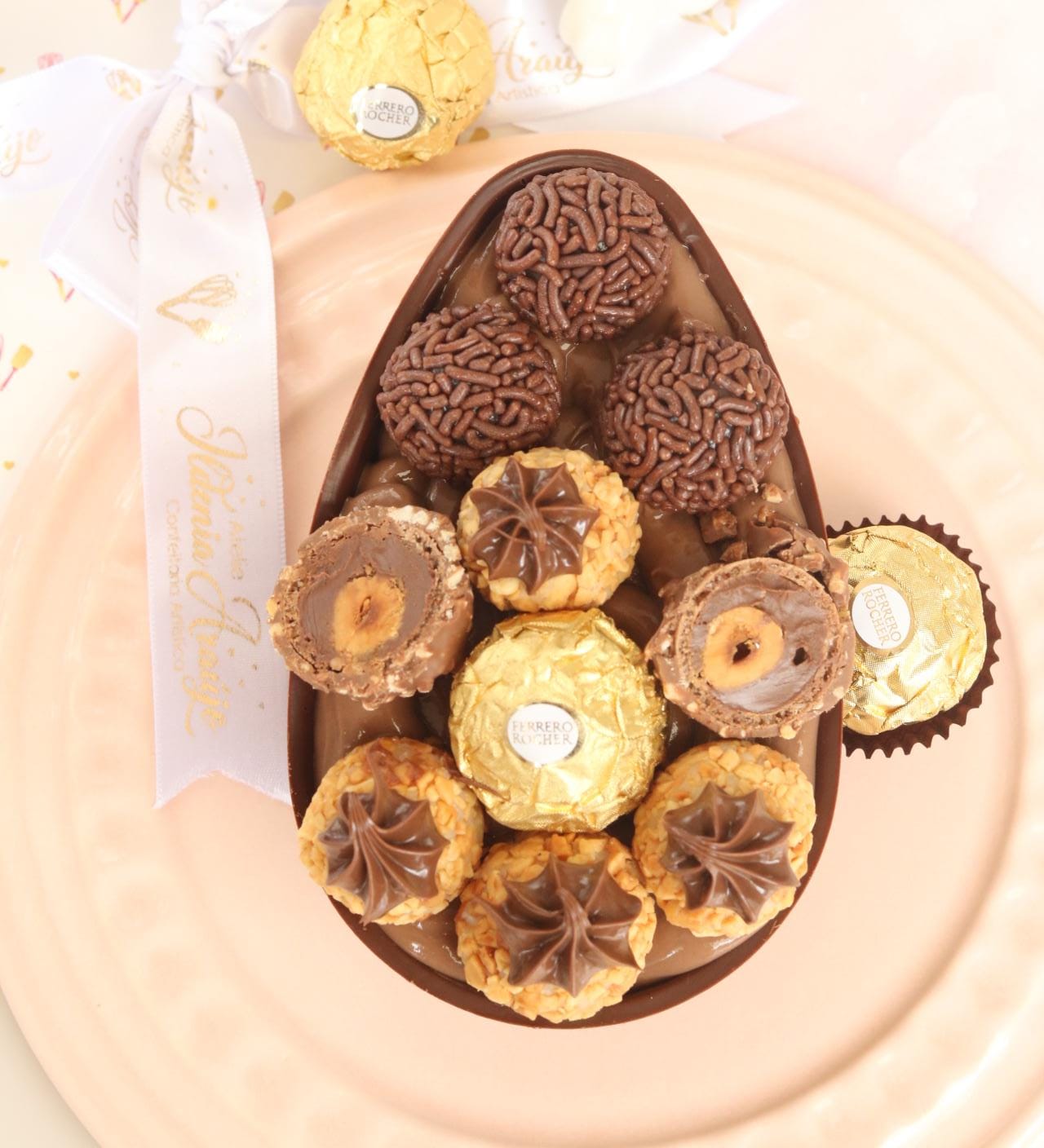 Ovo de Páscoa com casca de chocolate meio amargo, recheado com brigadeiro cremoso, nutella, amendoim triturado e bombons Ferrero Rocher. Uma verdadeira tentação! ✨