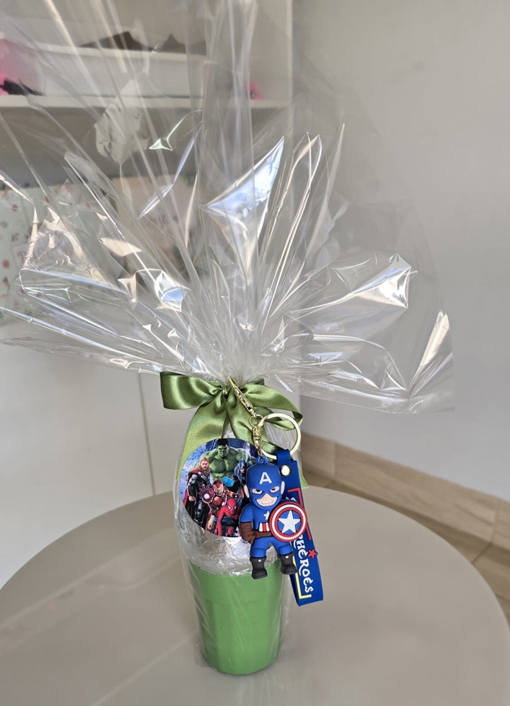 Ovo 250 gramas, 2 bandinhas de ovo com confete, 1 chaveiro com persornagem sortido, 1 copo.