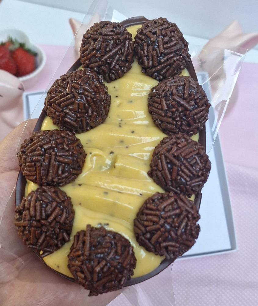 Casca de Chocolate meio amargo com recheio de Brigadeiro e Maracujá.