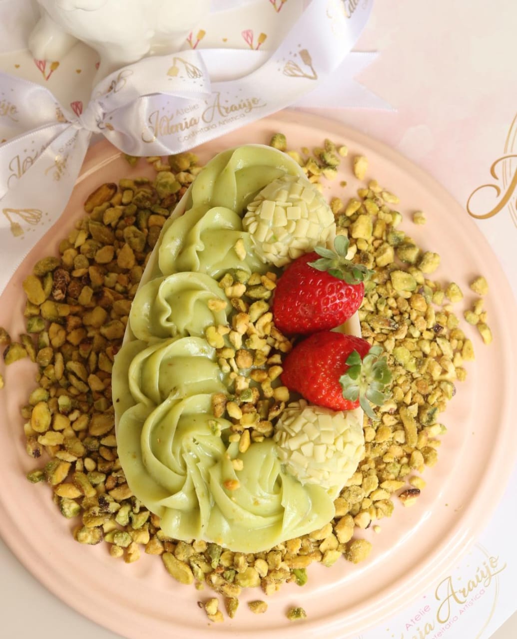 Uma explosão de sabores e texturas nesse ovo de Páscoa: a cremosidade do pistache, a acidez do morango e a crocância do pistache picado.